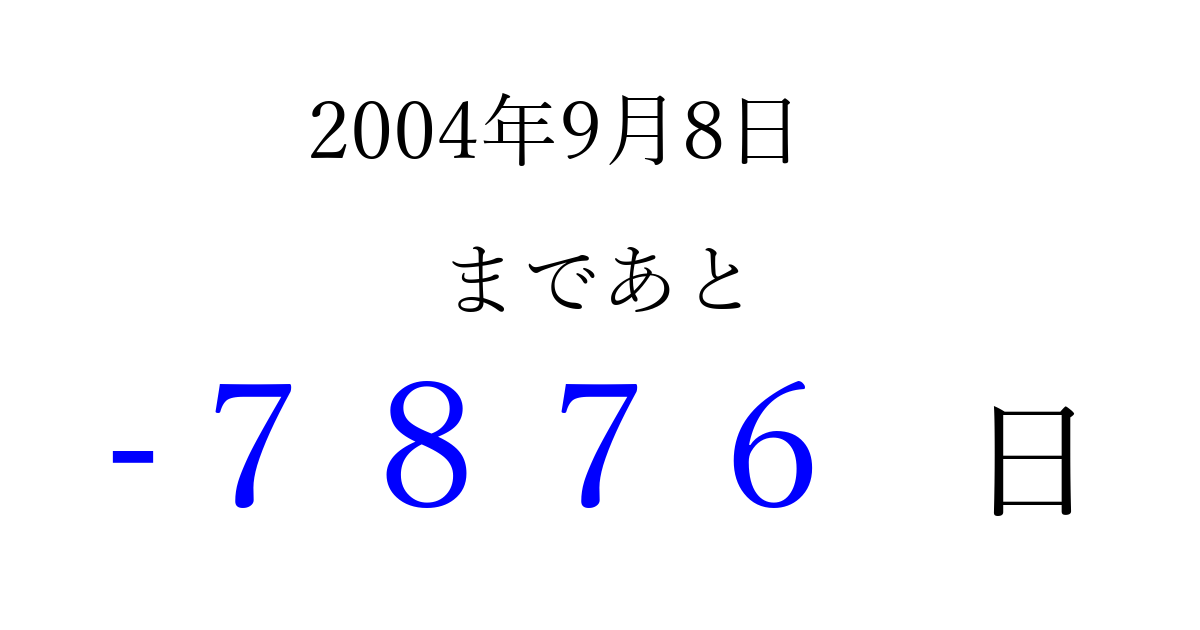 2004年9月8日(水)は もう 0000 日過ぎました 追加すると、トップページからすぐ選べるようになります ※2026/04/02現在の結果です。 最新の状態に更新する ↓シェアして、タイムライン上にカウントダウンを表示しよう!↓ 📤 この結果を共有する Tweet シェア Threads Bluesky 別の日付でカウントダウン 2004年9月のカレンダー このページをブックマークに追加すると、いつでもカウントダウンを確認できます。 (PC: Ctrl+D / Mac: ⌘+D) hitome-notes.comでは以下のページも運営しています。 指定日と期間から日付を計算 | ガチャ確率計算・シミュレーション | プライバシー・ポリシー 運営者:Avocado