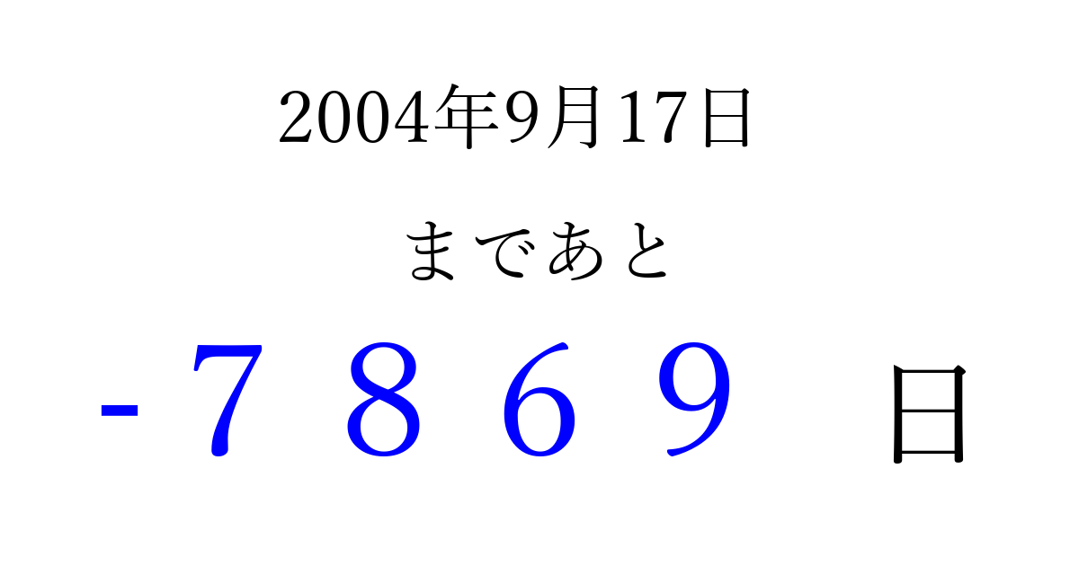 2004年9月17日(金)は もう 0000 日過ぎました 追加すると、トップページからすぐ選べるようになります ※2026/04/04現在の結果です。 最新の状態に更新する ↓シェアして、タイムライン上にカウントダウンを表示しよう!↓ 📤 この結果を共有する Tweet シェア Threads Bluesky 別の日付でカウントダウン 2004年9月のカレンダー このページをブックマークに追加すると、いつでもカウントダウンを確認できます。 (PC: Ctrl+D / Mac: ⌘+D) hitome-notes.comでは以下のページも運営しています。 指定日と期間から日付を計算 | ガチャ確率計算・シミュレーション | プライバシー・ポリシー 運営者:Avocado