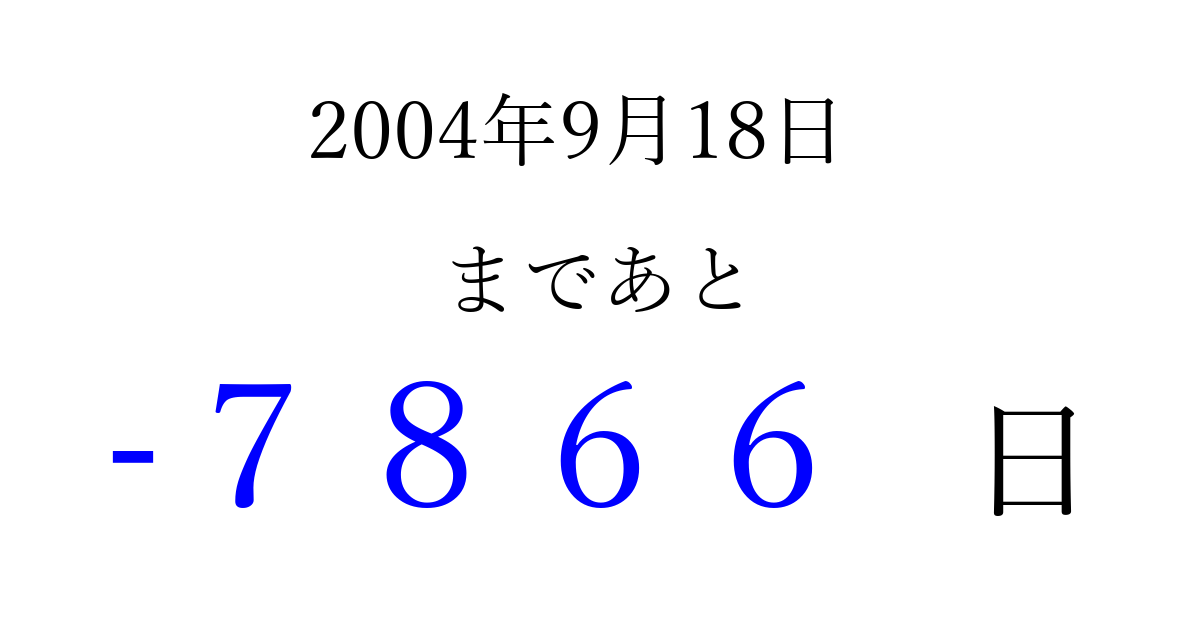 2004年9月18日(土)は もう 0000 日過ぎました 追加すると、トップページからすぐ選べるようになります ※2026/04/02現在の結果です。 最新の状態に更新する ↓シェアして、タイムライン上にカウントダウンを表示しよう!↓ 📤 この結果を共有する Tweet シェア Threads Bluesky 別の日付でカウントダウン 2004年9月のカレンダー このページをブックマークに追加すると、いつでもカウントダウンを確認できます。 (PC: Ctrl+D / Mac: ⌘+D) hitome-notes.comでは以下のページも運営しています。 指定日と期間から日付を計算 | ガチャ確率計算・シミュレーション | プライバシー・ポリシー 運営者:Avocado