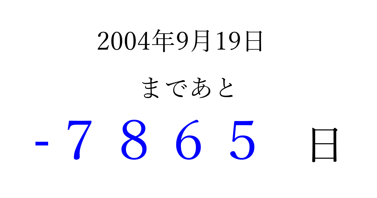 2004年9月19日(日)は もう 0000 日過ぎました 追加すると、トップページからすぐ選べるようになります ※2026/04/02現在の結果です。 最新の状態に更新する ↓シェアして、タイムライン上にカウントダウンを表示しよう!↓ 📤 この結果を共有する Tweet シェア Threads Bluesky 別の日付でカウントダウン 2004年9月のカレンダー このページをブックマークに追加すると、いつでもカウントダウンを確認できます。 (PC: Ctrl+D / Mac: ⌘+D) hitome-notes.comでは以下のページも運営しています。 指定日と期間から日付を計算 | ガチャ確率計算・シミュレーション | プライバシー・ポリシー 運営者:Avocado