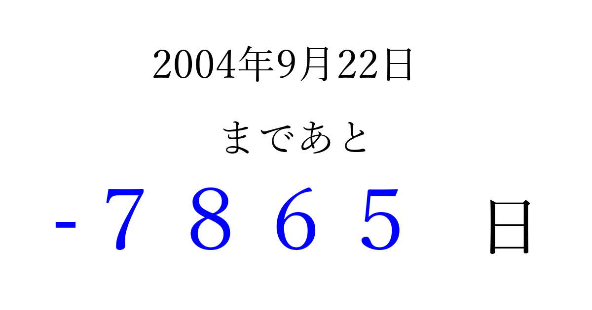 2004年9月22日(水)は もう 0000 日過ぎました 追加すると、トップページからすぐ選べるようになります ※2026/04/05現在の結果です。 最新の状態に更新する ↓シェアして、タイムライン上にカウントダウンを表示しよう!↓ 📤 この結果を共有する Tweet シェア Threads Bluesky 別の日付でカウントダウン 2004年9月のカレンダー このページをブックマークに追加すると、いつでもカウントダウンを確認できます。 (PC: Ctrl+D / Mac: ⌘+D) hitome-notes.comでは以下のページも運営しています。 指定日と期間から日付を計算 | ガチャ確率計算・シミュレーション | プライバシー・ポリシー 運営者:Avocado