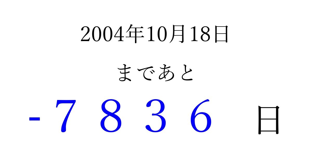 2004年10月18日(月)は もう 0000 日過ぎました 追加すると、トップページからすぐ選べるようになります ※2026/04/02現在の結果です。 最新の状態に更新する ↓シェアして、タイムライン上にカウントダウンを表示しよう!↓ 📤 この結果を共有する Tweet シェア Threads Bluesky 別の日付でカウントダウン 2004年10月のカレンダー このページをブックマークに追加すると、いつでもカウントダウンを確認できます。 (PC: Ctrl+D / Mac: ⌘+D) hitome-notes.comでは以下のページも運営しています。 指定日と期間から日付を計算 | ガチャ確率計算・シミュレーション | プライバシー・ポリシー 運営者:Avocado