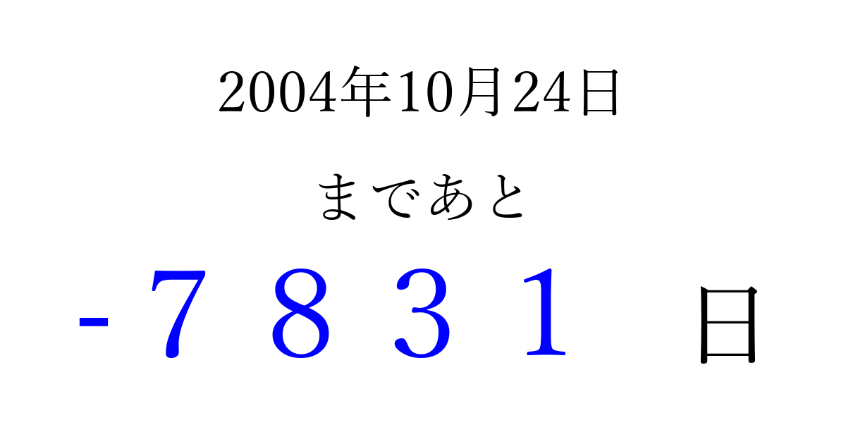 2004年10月24日(日)は もう 0000 日過ぎました 追加すると、トップページからすぐ選べるようになります ※2026/04/03現在の結果です。 最新の状態に更新する ↓シェアして、タイムライン上にカウントダウンを表示しよう!↓ 📤 この結果を共有する Tweet シェア Threads Bluesky 別の日付でカウントダウン 2004年10月のカレンダー このページをブックマークに追加すると、いつでもカウントダウンを確認できます。 (PC: Ctrl+D / Mac: ⌘+D) hitome-notes.comでは以下のページも運営しています。 指定日と期間から日付を計算 | ガチャ確率計算・シミュレーション | プライバシー・ポリシー 運営者:Avocado