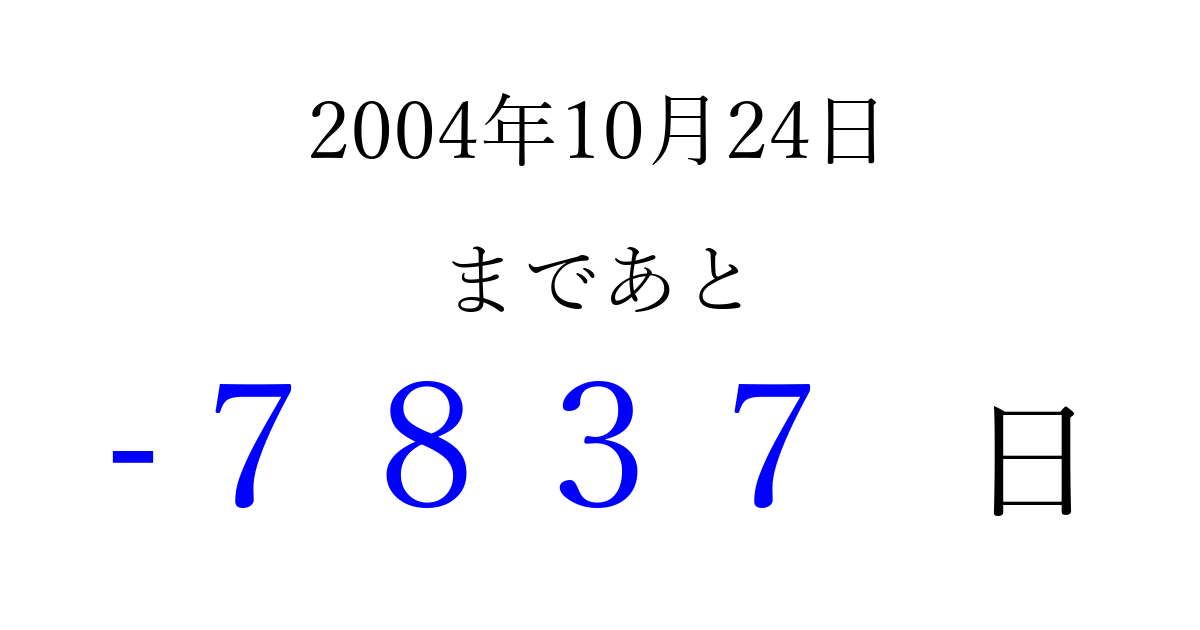 2004年10月24日(日)は もう 0000 日過ぎました 追加すると、トップページからすぐ選べるようになります ※2026/04/09現在の結果です。 最新の状態に更新する ↓シェアして、タイムライン上にカウントダウンを表示しよう!↓ 📤 この結果を共有する Tweet シェア Threads Bluesky 別の日付でカウントダウン 2004年10月のカレンダー このページをブックマークに追加すると、いつでもカウントダウンを確認できます。 (PC: Ctrl+D / Mac: ⌘+D) hitome-notes.comでは以下のページも運営しています。 指定日と期間から日付を計算 | ガチャ確率計算・シミュレーション | プライバシー・ポリシー 運営者:Avocado