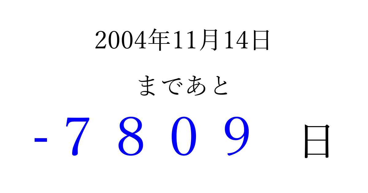 2004年11月14日(日)は もう 0000 日過ぎました 追加すると、トップページからすぐ選べるようになります ※2026/04/02現在の結果です。 最新の状態に更新する ↓シェアして、タイムライン上にカウントダウンを表示しよう!↓ 📤 この結果を共有する Tweet シェア Threads Bluesky 別の日付でカウントダウン 2004年11月のカレンダー このページをブックマークに追加すると、いつでもカウントダウンを確認できます。 (PC: Ctrl+D / Mac: ⌘+D) hitome-notes.comでは以下のページも運営しています。 指定日と期間から日付を計算 | ガチャ確率計算・シミュレーション | プライバシー・ポリシー 運営者:Avocado
