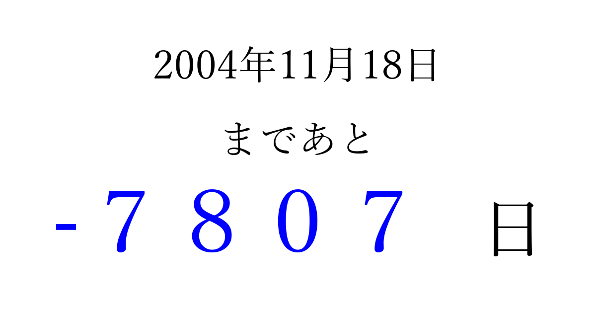 2004年11月18日(木)は もう 0000 日過ぎました 追加すると、トップページからすぐ選べるようになります ※2026/04/04現在の結果です。 最新の状態に更新する ↓シェアして、タイムライン上にカウントダウンを表示しよう!↓ 📤 この結果を共有する Tweet シェア Threads Bluesky 別の日付でカウントダウン 2004年11月のカレンダー このページをブックマークに追加すると、いつでもカウントダウンを確認できます。 (PC: Ctrl+D / Mac: ⌘+D) hitome-notes.comでは以下のページも運営しています。 指定日と期間から日付を計算 | ガチャ確率計算・シミュレーション | プライバシー・ポリシー 運営者:Avocado