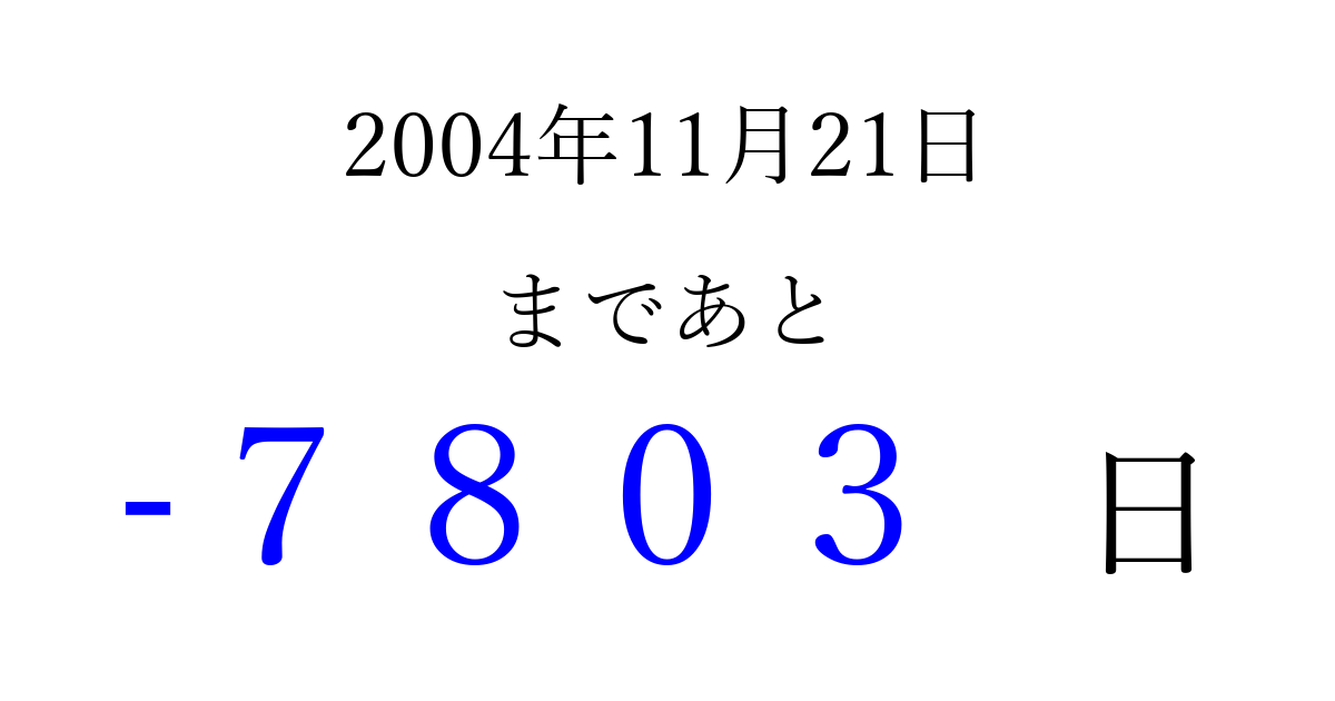 2004年11月21日(日)は もう 0000 日過ぎました 追加すると、トップページからすぐ選べるようになります ※2026/04/03現在の結果です。 最新の状態に更新する ↓シェアして、タイムライン上にカウントダウンを表示しよう!↓ 📤 この結果を共有する Tweet シェア Threads Bluesky 別の日付でカウントダウン 2004年11月のカレンダー このページをブックマークに追加すると、いつでもカウントダウンを確認できます。 (PC: Ctrl+D / Mac: ⌘+D) hitome-notes.comでは以下のページも運営しています。 指定日と期間から日付を計算 | ガチャ確率計算・シミュレーション | プライバシー・ポリシー 運営者:Avocado