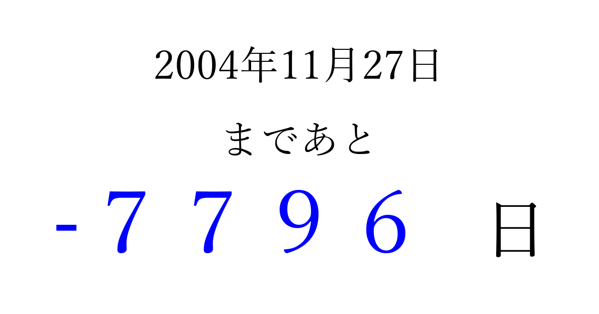 2004年11月27日(土)は もう 0000 日過ぎました 追加すると、トップページからすぐ選べるようになります ※2026/04/02現在の結果です。 最新の状態に更新する ↓シェアして、タイムライン上にカウントダウンを表示しよう!↓ 📤 この結果を共有する Tweet シェア Threads Bluesky 別の日付でカウントダウン 2004年11月のカレンダー このページをブックマークに追加すると、いつでもカウントダウンを確認できます。 (PC: Ctrl+D / Mac: ⌘+D) hitome-notes.comでは以下のページも運営しています。 指定日と期間から日付を計算 | ガチャ確率計算・シミュレーション | プライバシー・ポリシー 運営者:Avocado