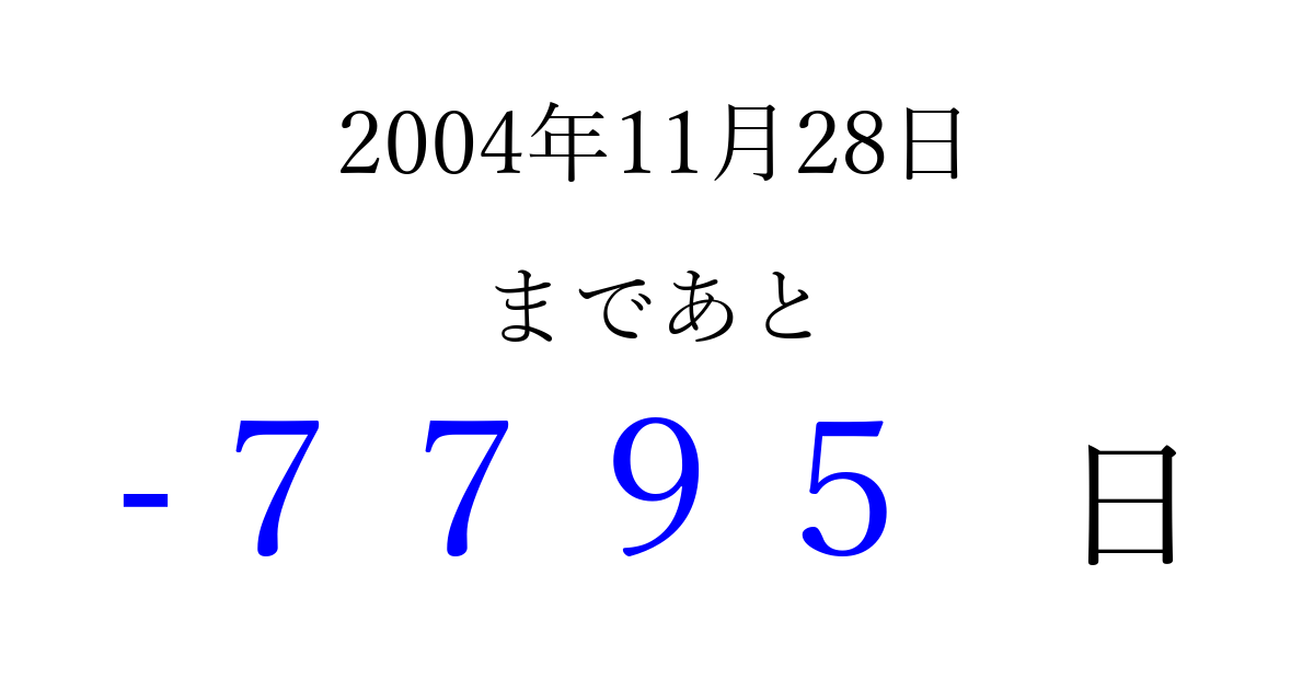 2004年11月28日(日)は もう 0000 日過ぎました 追加すると、トップページからすぐ選べるようになります ※2026/04/02現在の結果です。 最新の状態に更新する ↓シェアして、タイムライン上にカウントダウンを表示しよう!↓ 📤 この結果を共有する Tweet シェア Threads Bluesky 別の日付でカウントダウン 2004年11月のカレンダー このページをブックマークに追加すると、いつでもカウントダウンを確認できます。 (PC: Ctrl+D / Mac: ⌘+D) hitome-notes.comでは以下のページも運営しています。 指定日と期間から日付を計算 | ガチャ確率計算・シミュレーション | プライバシー・ポリシー 運営者:Avocado
