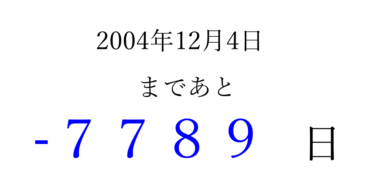 2004年12月4日(土)は もう 0000 日過ぎました 追加すると、トップページからすぐ選べるようになります ※2026/04/02現在の結果です。 最新の状態に更新する ↓シェアして、タイムライン上にカウントダウンを表示しよう!↓ 📤 この結果を共有する Tweet シェア Threads Bluesky 別の日付でカウントダウン 2004年12月のカレンダー このページをブックマークに追加すると、いつでもカウントダウンを確認できます。 (PC: Ctrl+D / Mac: ⌘+D) hitome-notes.comでは以下のページも運営しています。 指定日と期間から日付を計算 | ガチャ確率計算・シミュレーション | プライバシー・ポリシー 運営者:Avocado