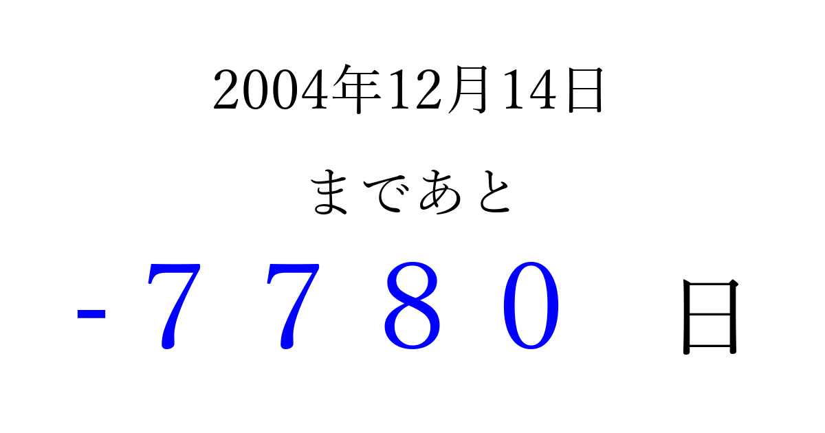 2004年12月14日(火)は もう 0000 日過ぎました 追加すると、トップページからすぐ選べるようになります ※2026/04/03現在の結果です。 最新の状態に更新する ↓シェアして、タイムライン上にカウントダウンを表示しよう!↓ 📤 この結果を共有する Tweet シェア Threads Bluesky 別の日付でカウントダウン 2004年12月のカレンダー このページをブックマークに追加すると、いつでもカウントダウンを確認できます。 (PC: Ctrl+D / Mac: ⌘+D) hitome-notes.comでは以下のページも運営しています。 指定日と期間から日付を計算 | ガチャ確率計算・シミュレーション | プライバシー・ポリシー 運営者:Avocado