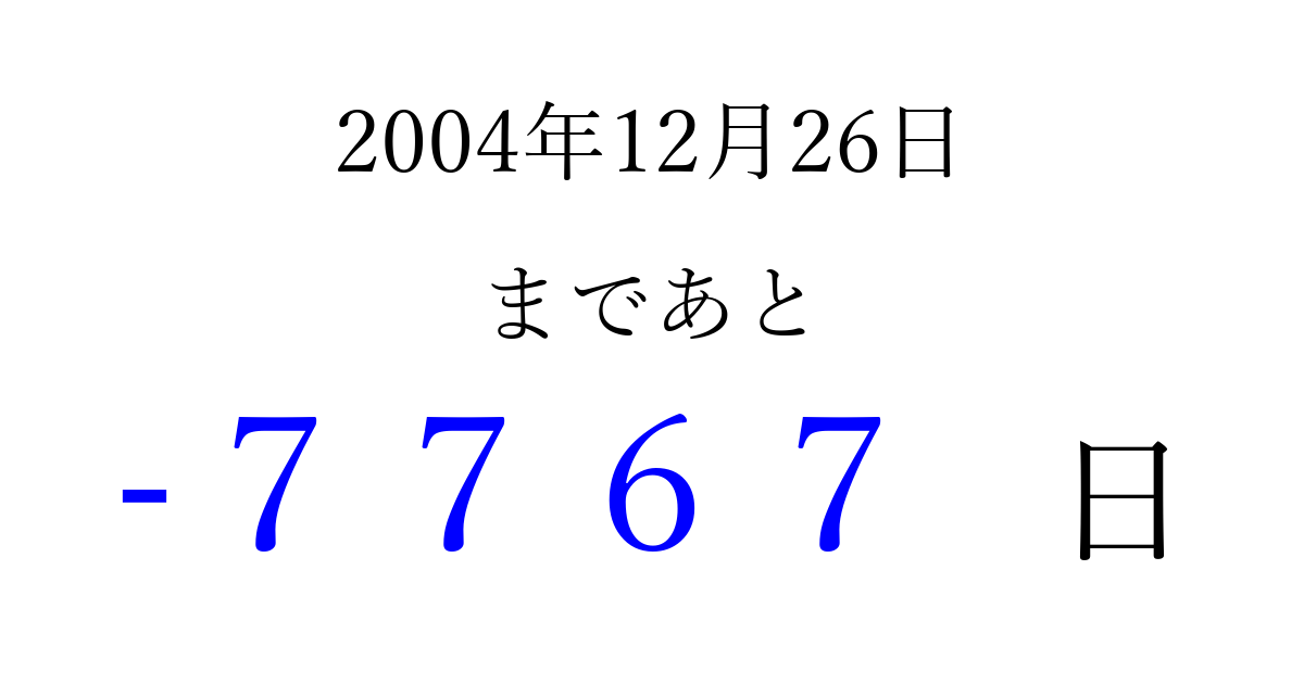 2004年12月26日(日)は もう 0000 日過ぎました 追加すると、トップページからすぐ選べるようになります ※2026/04/02現在の結果です。 最新の状態に更新する ↓シェアして、タイムライン上にカウントダウンを表示しよう!↓ 📤 この結果を共有する Tweet シェア Threads Bluesky 別の日付でカウントダウン 2004年12月のカレンダー このページをブックマークに追加すると、いつでもカウントダウンを確認できます。 (PC: Ctrl+D / Mac: ⌘+D) hitome-notes.comでは以下のページも運営しています。 指定日と期間から日付を計算 | ガチャ確率計算・シミュレーション | プライバシー・ポリシー 運営者:Avocado