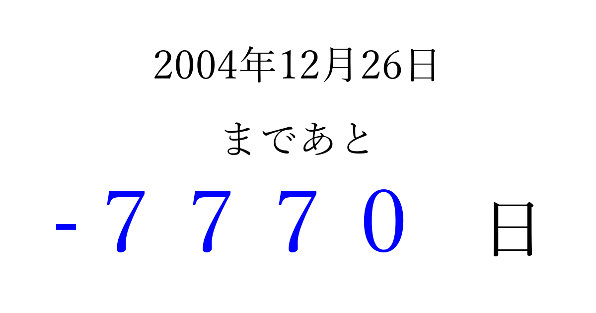 2004年12月26日(日)は もう 0000 日過ぎました 追加すると、トップページからすぐ選べるようになります ※2026/04/05現在の結果です。 最新の状態に更新する ↓シェアして、タイムライン上にカウントダウンを表示しよう!↓ 📤 この結果を共有する Tweet シェア Threads Bluesky 別の日付でカウントダウン 2004年12月のカレンダー このページをブックマークに追加すると、いつでもカウントダウンを確認できます。 (PC: Ctrl+D / Mac: ⌘+D) hitome-notes.comでは以下のページも運営しています。 指定日と期間から日付を計算 | ガチャ確率計算・シミュレーション | プライバシー・ポリシー 運営者:Avocado