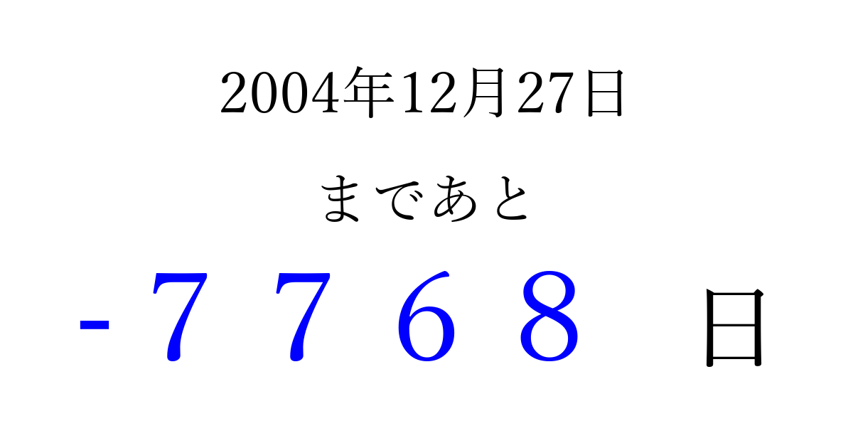 2004年12月27日(月)は もう 0000 日過ぎました 追加すると、トップページからすぐ選べるようになります ※2026/04/04現在の結果です。 最新の状態に更新する ↓シェアして、タイムライン上にカウントダウンを表示しよう!↓ 📤 この結果を共有する Tweet シェア Threads Bluesky 別の日付でカウントダウン 2004年12月のカレンダー このページをブックマークに追加すると、いつでもカウントダウンを確認できます。 (PC: Ctrl+D / Mac: ⌘+D) hitome-notes.comでは以下のページも運営しています。 指定日と期間から日付を計算 | ガチャ確率計算・シミュレーション | プライバシー・ポリシー 運営者:Avocado