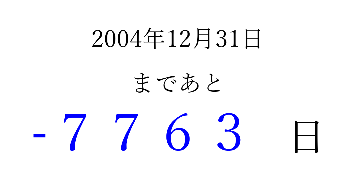 2004年12月31日(金)は もう 0000 日過ぎました 追加すると、トップページからすぐ選べるようになります ※2026/04/03現在の結果です。 最新の状態に更新する ↓シェアして、タイムライン上にカウントダウンを表示しよう!↓ 📤 この結果を共有する Tweet シェア Threads Bluesky 別の日付でカウントダウン 2004年12月のカレンダー このページをブックマークに追加すると、いつでもカウントダウンを確認できます。 (PC: Ctrl+D / Mac: ⌘+D) hitome-notes.comでは以下のページも運営しています。 指定日と期間から日付を計算 | ガチャ確率計算・シミュレーション | プライバシー・ポリシー 運営者:Avocado