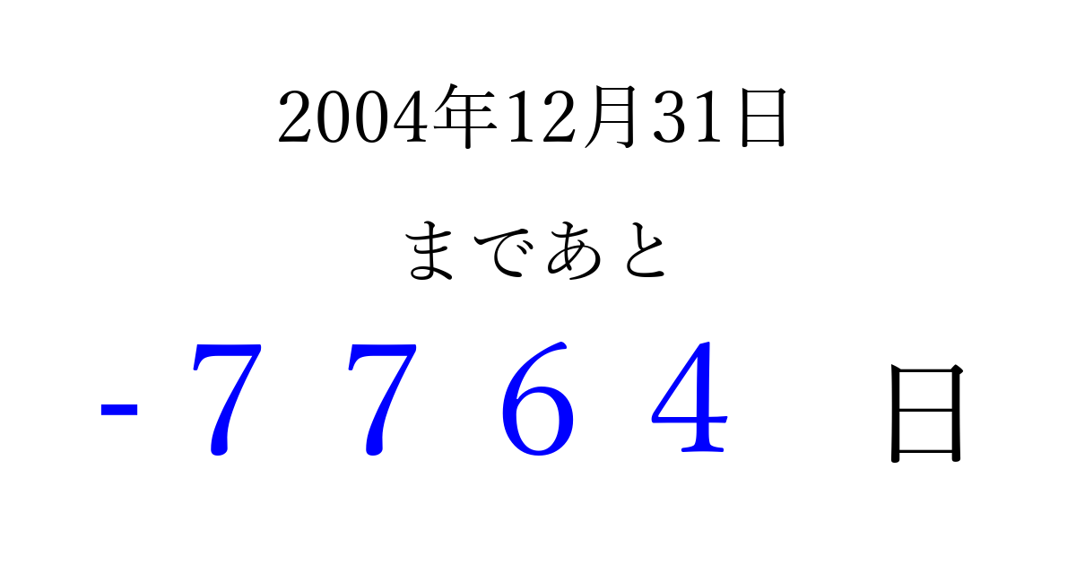 2004年12月31日(金)は もう 0000 日過ぎました 追加すると、トップページからすぐ選べるようになります ※2026/04/04現在の結果です。 最新の状態に更新する ↓シェアして、タイムライン上にカウントダウンを表示しよう!↓ 📤 この結果を共有する Tweet シェア Threads Bluesky 別の日付でカウントダウン 2004年12月のカレンダー このページをブックマークに追加すると、いつでもカウントダウンを確認できます。 (PC: Ctrl+D / Mac: ⌘+D) hitome-notes.comでは以下のページも運営しています。 指定日と期間から日付を計算 | ガチャ確率計算・シミュレーション | プライバシー・ポリシー 運営者:Avocado