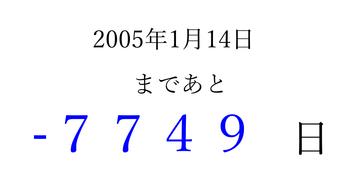2005年1月14日(金)は もう 0000 日過ぎました 追加すると、トップページからすぐ選べるようになります ※2026/04/03現在の結果です。 最新の状態に更新する ↓シェアして、タイムライン上にカウントダウンを表示しよう!↓ 📤 この結果を共有する Tweet シェア Threads Bluesky 別の日付でカウントダウン 2005年1月のカレンダー このページをブックマークに追加すると、いつでもカウントダウンを確認できます。 (PC: Ctrl+D / Mac: ⌘+D) hitome-notes.comでは以下のページも運営しています。 指定日と期間から日付を計算 | ガチャ確率計算・シミュレーション | プライバシー・ポリシー 運営者:Avocado
