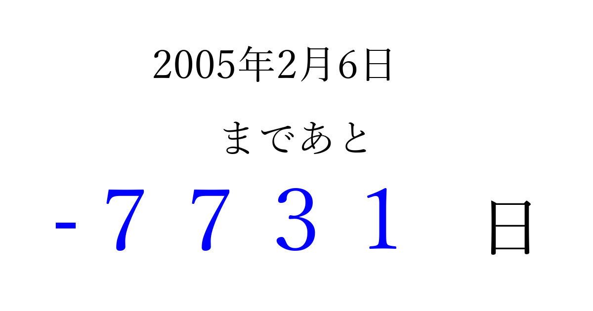 2005年2月6日(日)は もう 0000 日過ぎました 追加すると、トップページからすぐ選べるようになります ※2026/04/08現在の結果です。 最新の状態に更新する ↓シェアして、タイムライン上にカウントダウンを表示しよう!↓ 📤 この結果を共有する Tweet シェア Threads Bluesky 別の日付でカウントダウン 2005年2月のカレンダー このページをブックマークに追加すると、いつでもカウントダウンを確認できます。 (PC: Ctrl+D / Mac: ⌘+D) hitome-notes.comでは以下のページも運営しています。 指定日と期間から日付を計算 | ガチャ確率計算・シミュレーション | プライバシー・ポリシー 運営者:Avocado