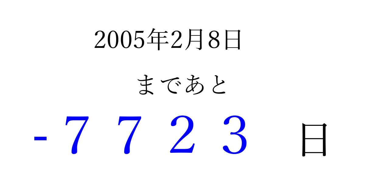 2005年2月8日(火)は もう 0000 日過ぎました 追加すると、トップページからすぐ選べるようになります ※2026/04/02現在の結果です。 最新の状態に更新する ↓シェアして、タイムライン上にカウントダウンを表示しよう!↓ 📤 この結果を共有する Tweet シェア Threads Bluesky 別の日付でカウントダウン 2005年2月のカレンダー このページをブックマークに追加すると、いつでもカウントダウンを確認できます。 (PC: Ctrl+D / Mac: ⌘+D) hitome-notes.comでは以下のページも運営しています。 指定日と期間から日付を計算 | ガチャ確率計算・シミュレーション | プライバシー・ポリシー 運営者:Avocado