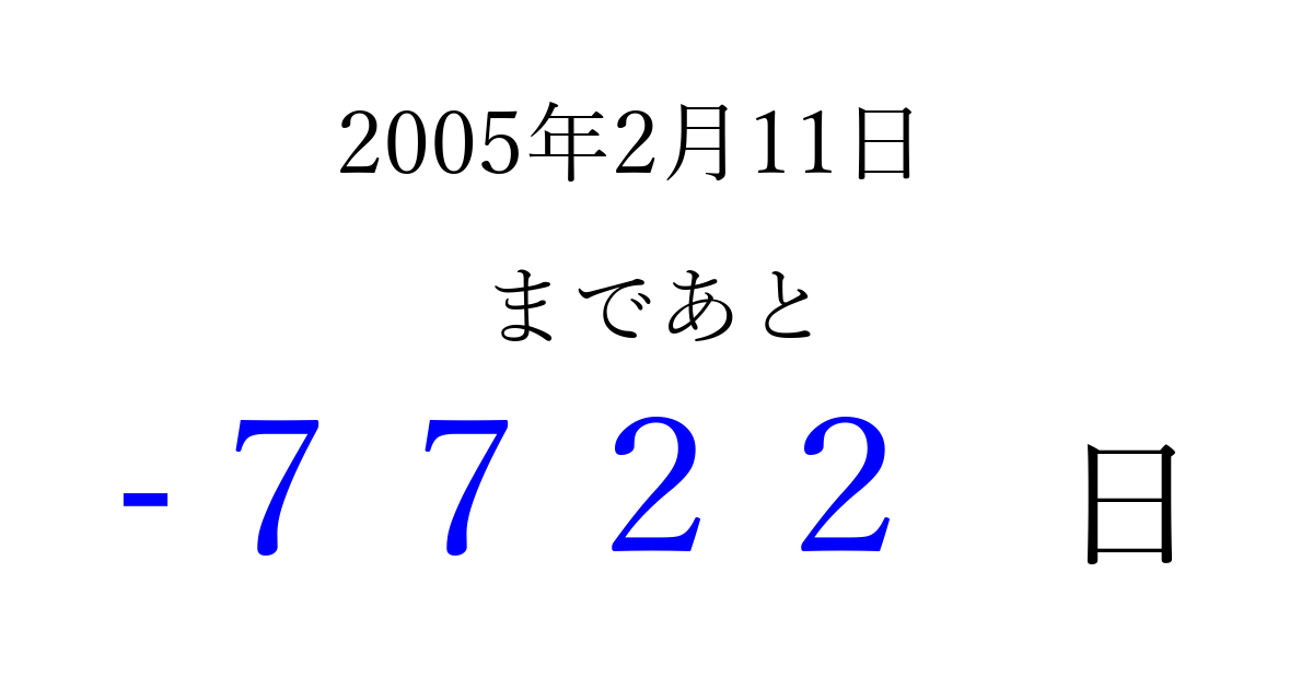 2005年2月11日(金)は もう 0000 日過ぎました 追加すると、トップページからすぐ選べるようになります ※2026/04/04現在の結果です。 最新の状態に更新する ↓シェアして、タイムライン上にカウントダウンを表示しよう!↓ 📤 この結果を共有する Tweet シェア Threads Bluesky 別の日付でカウントダウン 2005年2月のカレンダー このページをブックマークに追加すると、いつでもカウントダウンを確認できます。 (PC: Ctrl+D / Mac: ⌘+D) hitome-notes.comでは以下のページも運営しています。 指定日と期間から日付を計算 | ガチャ確率計算・シミュレーション | プライバシー・ポリシー 運営者:Avocado