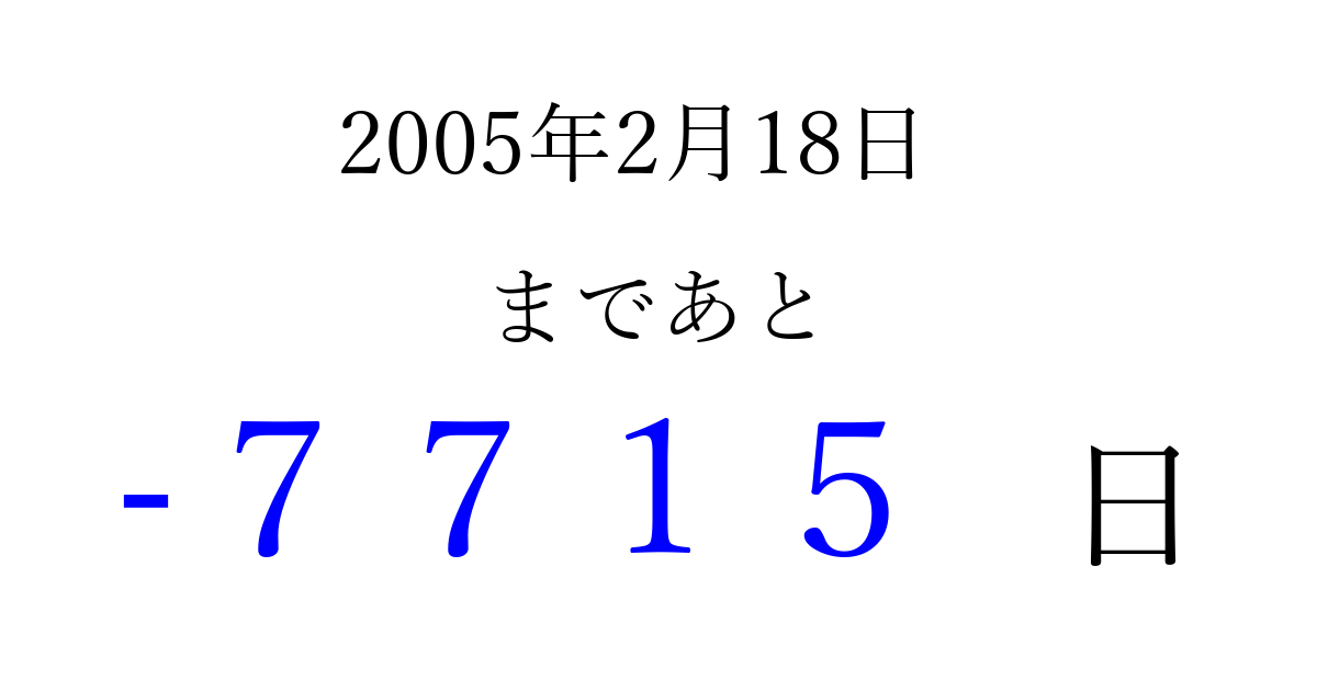 2005年2月18日(金)は もう 0000 日過ぎました 追加すると、トップページからすぐ選べるようになります ※2026/04/04現在の結果です。 最新の状態に更新する ↓シェアして、タイムライン上にカウントダウンを表示しよう!↓ 📤 この結果を共有する Tweet シェア Threads Bluesky 別の日付でカウントダウン 2005年2月のカレンダー このページをブックマークに追加すると、いつでもカウントダウンを確認できます。 (PC: Ctrl+D / Mac: ⌘+D) hitome-notes.comでは以下のページも運営しています。 指定日と期間から日付を計算 | ガチャ確率計算・シミュレーション | プライバシー・ポリシー 運営者:Avocado
