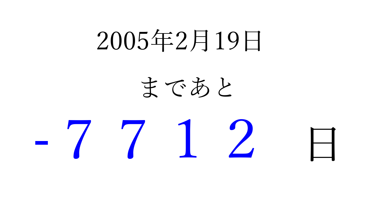 2005年2月19日(土)は もう 0000 日過ぎました 追加すると、トップページからすぐ選べるようになります ※2026/04/02現在の結果です。 最新の状態に更新する ↓シェアして、タイムライン上にカウントダウンを表示しよう!↓ 📤 この結果を共有する Tweet シェア Threads Bluesky 別の日付でカウントダウン 2005年2月のカレンダー このページをブックマークに追加すると、いつでもカウントダウンを確認できます。 (PC: Ctrl+D / Mac: ⌘+D) hitome-notes.comでは以下のページも運営しています。 指定日と期間から日付を計算 | ガチャ確率計算・シミュレーション | プライバシー・ポリシー 運営者:Avocado