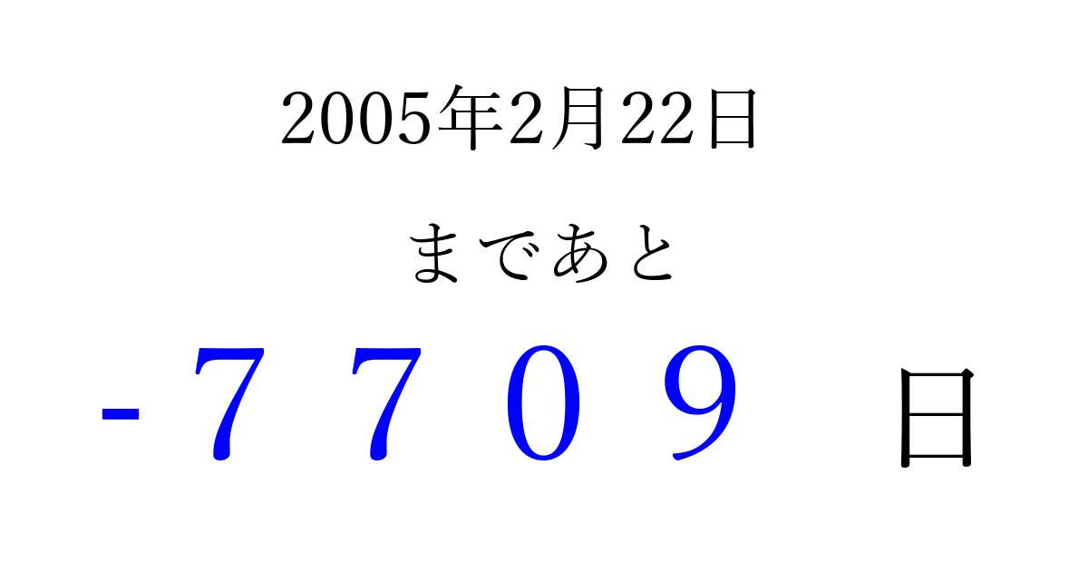 2005年2月22日(火)は もう 0000 日過ぎました 追加すると、トップページからすぐ選べるようになります ※2026/04/02現在の結果です。 最新の状態に更新する ↓シェアして、タイムライン上にカウントダウンを表示しよう!↓ 📤 この結果を共有する Tweet シェア Threads Bluesky 別の日付でカウントダウン 2005年2月のカレンダー このページをブックマークに追加すると、いつでもカウントダウンを確認できます。 (PC: Ctrl+D / Mac: ⌘+D) hitome-notes.comでは以下のページも運営しています。 指定日と期間から日付を計算 | ガチャ確率計算・シミュレーション | プライバシー・ポリシー 運営者:Avocado