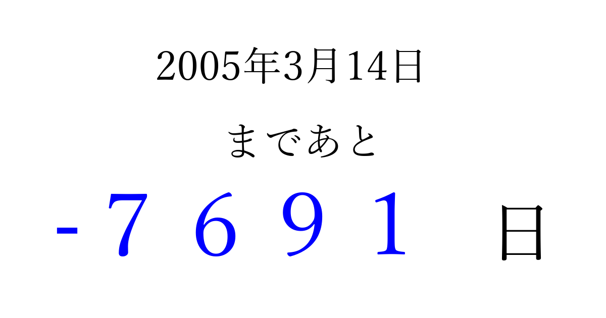 2005年3月14日(月)は もう 0000 日過ぎました 追加すると、トップページからすぐ選べるようになります ※2026/04/04現在の結果です。 最新の状態に更新する ↓シェアして、タイムライン上にカウントダウンを表示しよう!↓ 📤 この結果を共有する Tweet シェア Threads Bluesky 別の日付でカウントダウン 2005年3月のカレンダー このページをブックマークに追加すると、いつでもカウントダウンを確認できます。 (PC: Ctrl+D / Mac: ⌘+D) hitome-notes.comでは以下のページも運営しています。 指定日と期間から日付を計算 | ガチャ確率計算・シミュレーション | プライバシー・ポリシー 運営者:Avocado