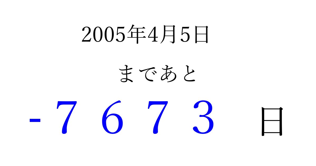 2005年4月5日(火)は もう 0000 日過ぎました 追加すると、トップページからすぐ選べるようになります ※2026/04/08現在の結果です。 最新の状態に更新する ↓シェアして、タイムライン上にカウントダウンを表示しよう!↓ 📤 この結果を共有する Tweet シェア Threads Bluesky 別の日付でカウントダウン 2005年4月のカレンダー このページをブックマークに追加すると、いつでもカウントダウンを確認できます。 (PC: Ctrl+D / Mac: ⌘+D) hitome-notes.comでは以下のページも運営しています。 指定日と期間から日付を計算 | ガチャ確率計算・シミュレーション | プライバシー・ポリシー 運営者:Avocado