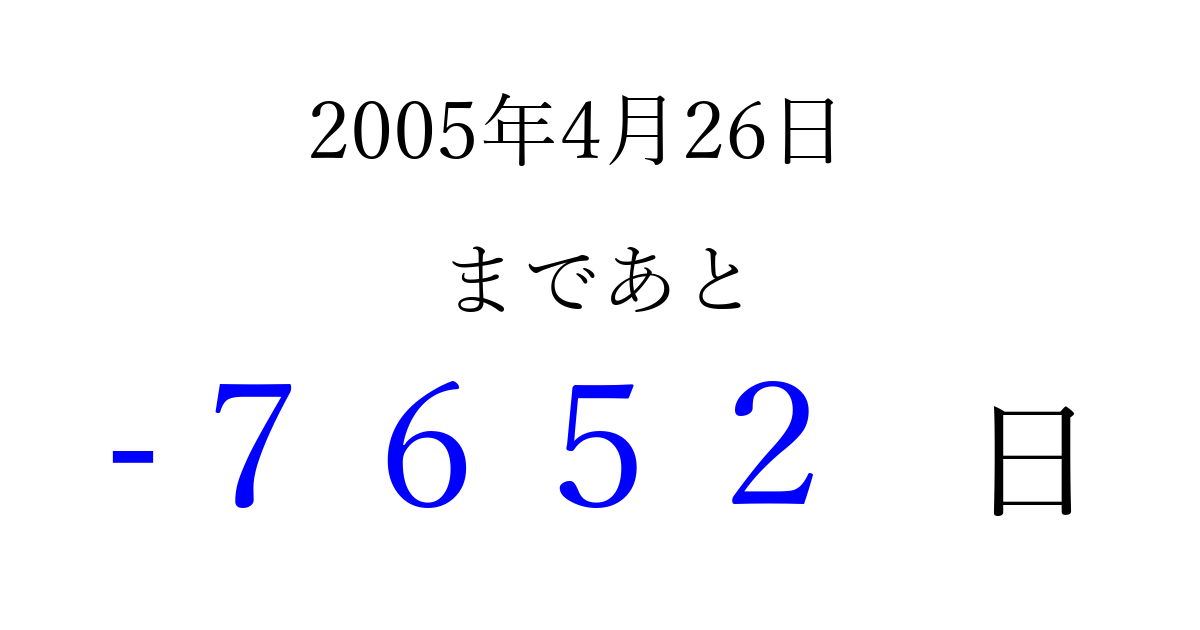 2005年4月26日(火)は もう 0000 日過ぎました 追加すると、トップページからすぐ選べるようになります ※2026/04/08現在の結果です。 最新の状態に更新する ↓シェアして、タイムライン上にカウントダウンを表示しよう!↓ 📤 この結果を共有する Tweet シェア Threads Bluesky 別の日付でカウントダウン 2005年4月のカレンダー このページをブックマークに追加すると、いつでもカウントダウンを確認できます。 (PC: Ctrl+D / Mac: ⌘+D) hitome-notes.comでは以下のページも運営しています。 指定日と期間から日付を計算 | ガチャ確率計算・シミュレーション | プライバシー・ポリシー 運営者:Avocado