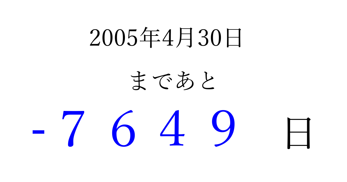 2005年4月30日(土)は もう 0000 日過ぎました 追加すると、トップページからすぐ選べるようになります ※2026/04/09現在の結果です。 最新の状態に更新する ↓シェアして、タイムライン上にカウントダウンを表示しよう!↓ 📤 この結果を共有する Tweet シェア Threads Bluesky 別の日付でカウントダウン 2005年4月のカレンダー このページをブックマークに追加すると、いつでもカウントダウンを確認できます。 (PC: Ctrl+D / Mac: ⌘+D) hitome-notes.comでは以下のページも運営しています。 指定日と期間から日付を計算 | ガチャ確率計算・シミュレーション | プライバシー・ポリシー 運営者:Avocado