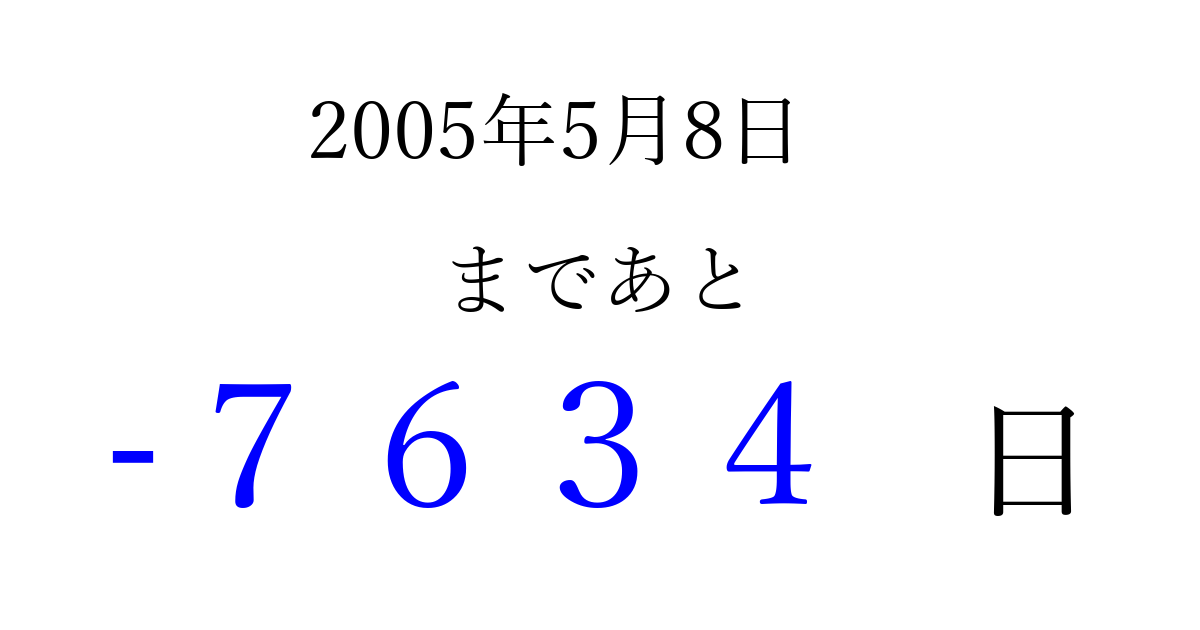 2005年5月8日(日)は もう 0000 日過ぎました 追加すると、トップページからすぐ選べるようになります ※2026/04/02現在の結果です。 最新の状態に更新する ↓シェアして、タイムライン上にカウントダウンを表示しよう!↓ 📤 この結果を共有する Tweet シェア Threads Bluesky 別の日付でカウントダウン 2005年5月のカレンダー このページをブックマークに追加すると、いつでもカウントダウンを確認できます。 (PC: Ctrl+D / Mac: ⌘+D) hitome-notes.comでは以下のページも運営しています。 指定日と期間から日付を計算 | ガチャ確率計算・シミュレーション | プライバシー・ポリシー 運営者:Avocado