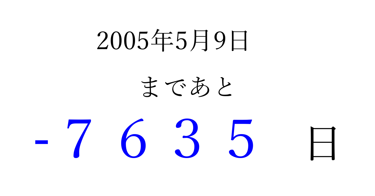 2005年5月9日(月)は もう 0000 日過ぎました 追加すると、トップページからすぐ選べるようになります ※2026/04/04現在の結果です。 最新の状態に更新する ↓シェアして、タイムライン上にカウントダウンを表示しよう!↓ 📤 この結果を共有する Tweet シェア Threads Bluesky 別の日付でカウントダウン 2005年5月のカレンダー このページをブックマークに追加すると、いつでもカウントダウンを確認できます。 (PC: Ctrl+D / Mac: ⌘+D) hitome-notes.comでは以下のページも運営しています。 指定日と期間から日付を計算 | ガチャ確率計算・シミュレーション | プライバシー・ポリシー 運営者:Avocado