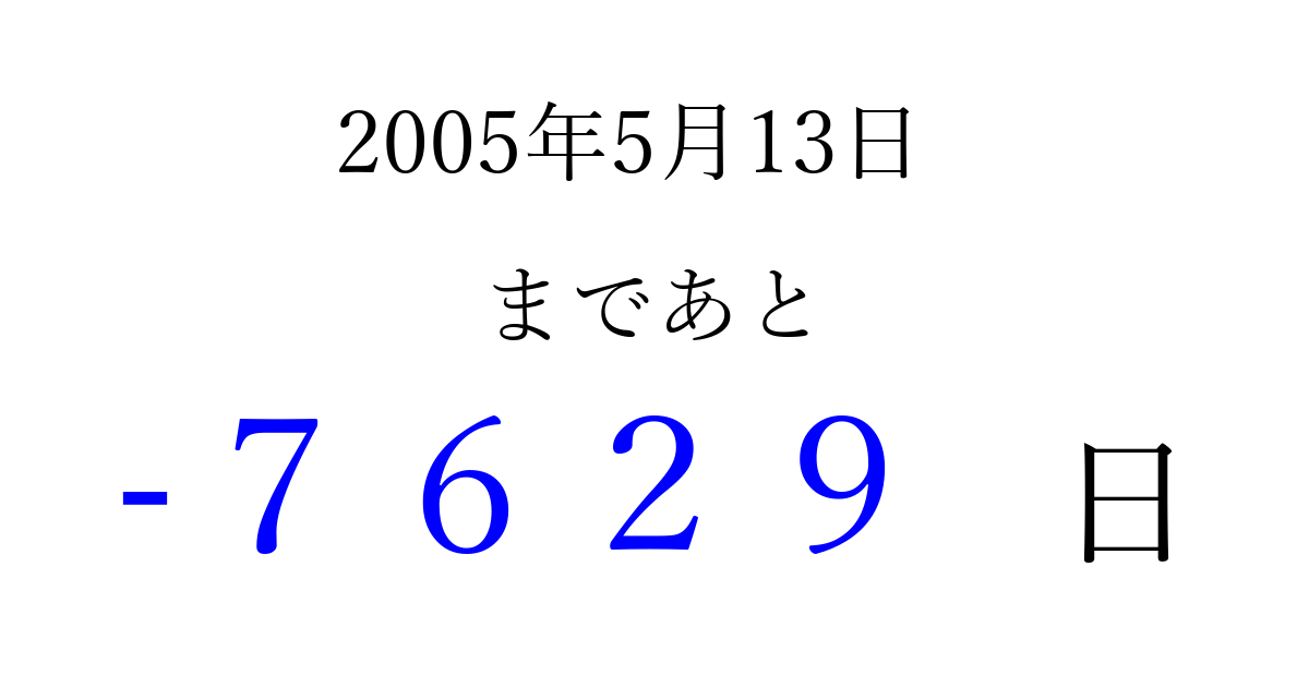 2005年5月13日(金)は もう 0000 日過ぎました 追加すると、トップページからすぐ選べるようになります ※2026/04/02現在の結果です。 最新の状態に更新する ↓シェアして、タイムライン上にカウントダウンを表示しよう!↓ 📤 この結果を共有する Tweet シェア Threads Bluesky 別の日付でカウントダウン 2005年5月のカレンダー このページをブックマークに追加すると、いつでもカウントダウンを確認できます。 (PC: Ctrl+D / Mac: ⌘+D) hitome-notes.comでは以下のページも運営しています。 指定日と期間から日付を計算 | ガチャ確率計算・シミュレーション | プライバシー・ポリシー 運営者:Avocado