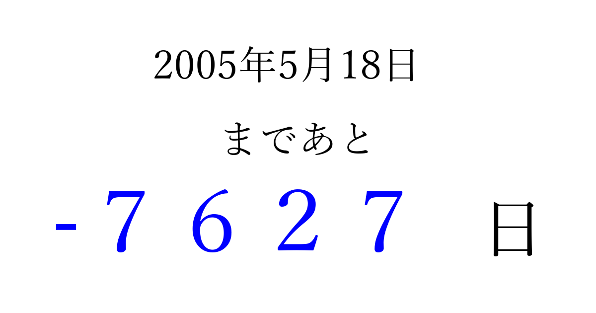 2005年5月18日(水)は もう 0000 日過ぎました 追加すると、トップページからすぐ選べるようになります ※2026/04/05現在の結果です。 最新の状態に更新する ↓シェアして、タイムライン上にカウントダウンを表示しよう!↓ 📤 この結果を共有する Tweet シェア Threads Bluesky 別の日付でカウントダウン 2005年5月のカレンダー このページをブックマークに追加すると、いつでもカウントダウンを確認できます。 (PC: Ctrl+D / Mac: ⌘+D) hitome-notes.comでは以下のページも運営しています。 指定日と期間から日付を計算 | ガチャ確率計算・シミュレーション | プライバシー・ポリシー 運営者:Avocado
