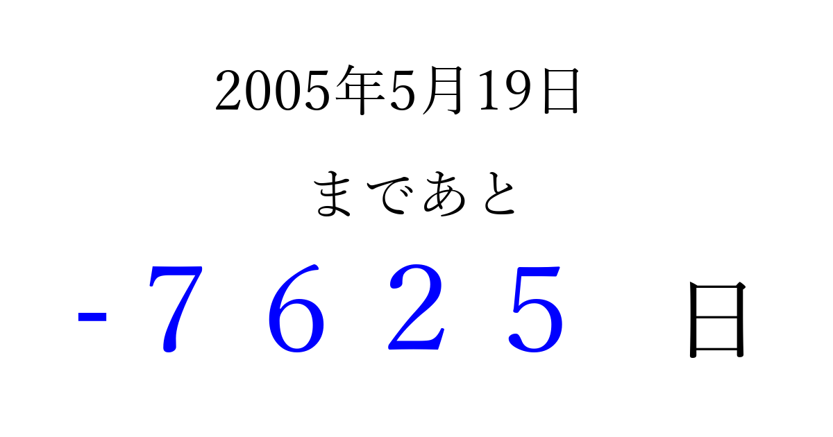 2005年5月19日(木)は もう 0000 日過ぎました 追加すると、トップページからすぐ選べるようになります ※2026/04/04現在の結果です。 最新の状態に更新する ↓シェアして、タイムライン上にカウントダウンを表示しよう!↓ 📤 この結果を共有する Tweet シェア Threads Bluesky 別の日付でカウントダウン 2005年5月のカレンダー このページをブックマークに追加すると、いつでもカウントダウンを確認できます。 (PC: Ctrl+D / Mac: ⌘+D) hitome-notes.comでは以下のページも運営しています。 指定日と期間から日付を計算 | ガチャ確率計算・シミュレーション | プライバシー・ポリシー 運営者:Avocado
