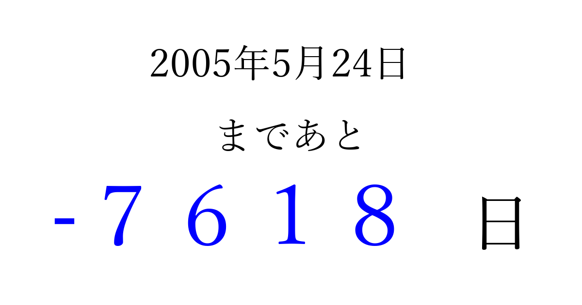 2005年5月24日(火)は もう 0000 日過ぎました 追加すると、トップページからすぐ選べるようになります ※2026/04/02現在の結果です。 最新の状態に更新する ↓シェアして、タイムライン上にカウントダウンを表示しよう!↓ 📤 この結果を共有する Tweet シェア Threads Bluesky 別の日付でカウントダウン 2005年5月のカレンダー このページをブックマークに追加すると、いつでもカウントダウンを確認できます。 (PC: Ctrl+D / Mac: ⌘+D) hitome-notes.comでは以下のページも運営しています。 指定日と期間から日付を計算 | ガチャ確率計算・シミュレーション | プライバシー・ポリシー 運営者:Avocado