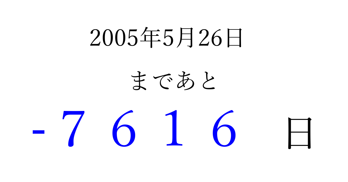 2005年5月26日(木)は もう 0000 日過ぎました 追加すると、トップページからすぐ選べるようになります ※2026/04/02現在の結果です。 最新の状態に更新する ↓シェアして、タイムライン上にカウントダウンを表示しよう!↓ 📤 この結果を共有する Tweet シェア Threads Bluesky 別の日付でカウントダウン 2005年5月のカレンダー このページをブックマークに追加すると、いつでもカウントダウンを確認できます。 (PC: Ctrl+D / Mac: ⌘+D) hitome-notes.comでは以下のページも運営しています。 指定日と期間から日付を計算 | ガチャ確率計算・シミュレーション | プライバシー・ポリシー 運営者:Avocado