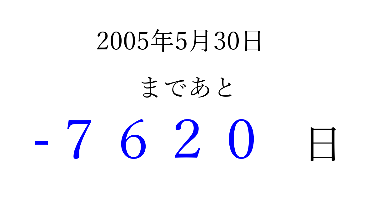 2005年5月30日(月)は もう 0000 日過ぎました 追加すると、トップページからすぐ選べるようになります ※2026/04/10現在の結果です。 最新の状態に更新する ↓シェアして、タイムライン上にカウントダウンを表示しよう!↓ 📤 この結果を共有する Tweet シェア Threads Bluesky 別の日付でカウントダウン 2005年5月のカレンダー このページをブックマークに追加すると、いつでもカウントダウンを確認できます。 (PC: Ctrl+D / Mac: ⌘+D) hitome-notes.comでは以下のページも運営しています。 指定日と期間から日付を計算 | ガチャ確率計算・シミュレーション | プライバシー・ポリシー 運営者:Avocado