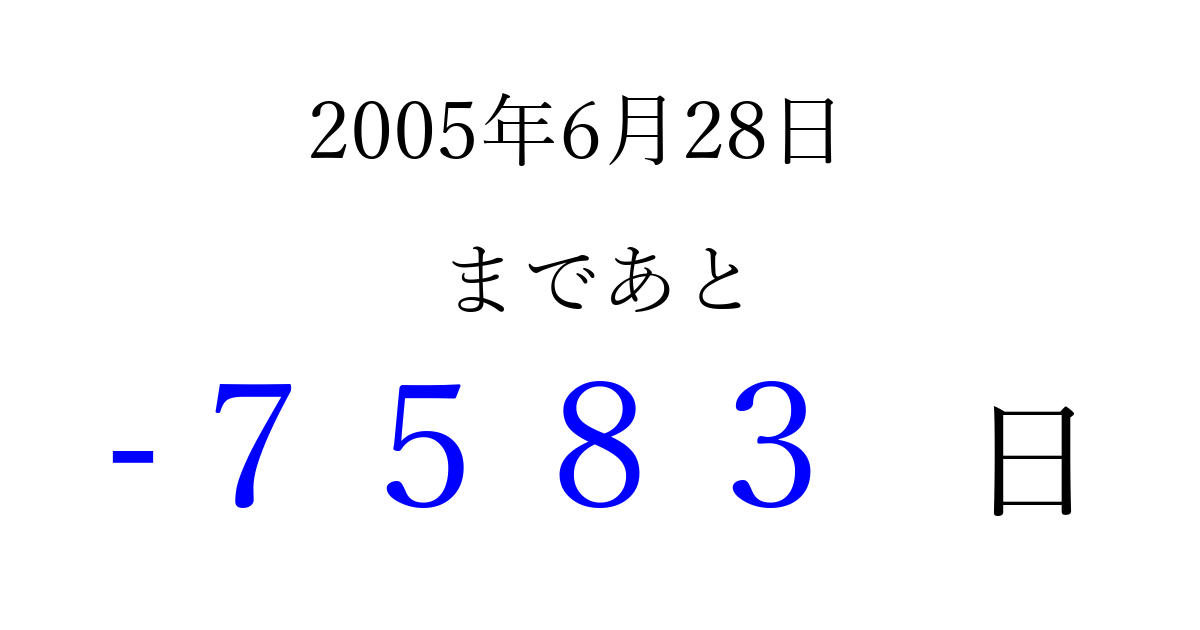 2005年6月28日(火)は もう 0000 日過ぎました 追加すると、トップページからすぐ選べるようになります ※2026/04/02現在の結果です。 最新の状態に更新する ↓シェアして、タイムライン上にカウントダウンを表示しよう!↓ 📤 この結果を共有する Tweet シェア Threads Bluesky 別の日付でカウントダウン 2005年6月のカレンダー このページをブックマークに追加すると、いつでもカウントダウンを確認できます。 (PC: Ctrl+D / Mac: ⌘+D) hitome-notes.comでは以下のページも運営しています。 指定日と期間から日付を計算 | ガチャ確率計算・シミュレーション | プライバシー・ポリシー 運営者:Avocado