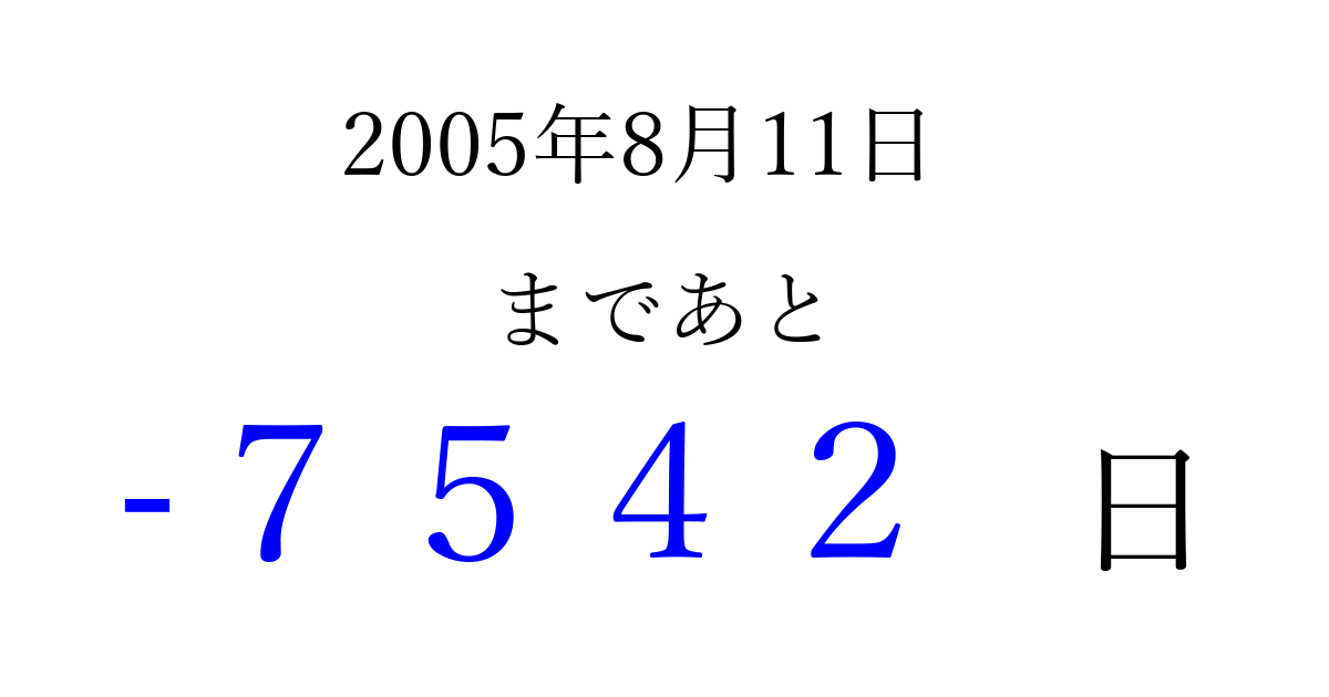 2005年8月11日(木)は もう 0000 日過ぎました 追加すると、トップページからすぐ選べるようになります ※2026/04/05現在の結果です。 最新の状態に更新する ↓シェアして、タイムライン上にカウントダウンを表示しよう!↓ 📤 この結果を共有する Tweet シェア Threads Bluesky 別の日付でカウントダウン 2005年8月のカレンダー このページをブックマークに追加すると、いつでもカウントダウンを確認できます。 (PC: Ctrl+D / Mac: ⌘+D) hitome-notes.comでは以下のページも運営しています。 指定日と期間から日付を計算 | ガチャ確率計算・シミュレーション | プライバシー・ポリシー 運営者:Avocado