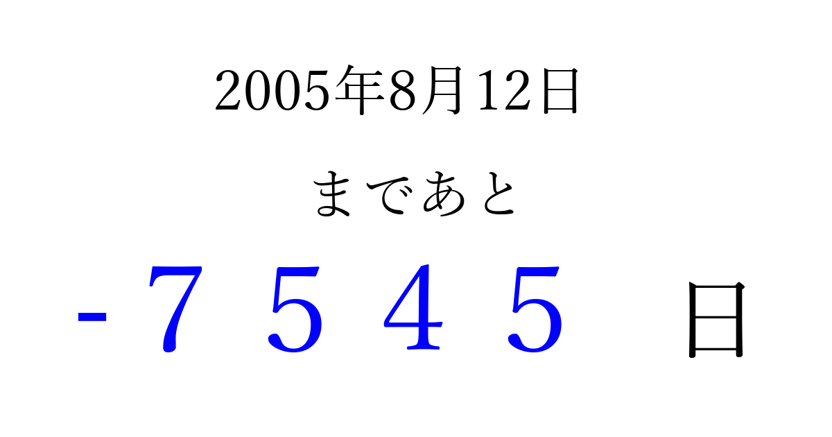 2005年8月12日(金)は もう 0000 日過ぎました 追加すると、トップページからすぐ選べるようになります ※2026/04/09現在の結果です。 最新の状態に更新する ↓シェアして、タイムライン上にカウントダウンを表示しよう!↓ 📤 この結果を共有する Tweet シェア Threads Bluesky 別の日付でカウントダウン 2005年8月のカレンダー このページをブックマークに追加すると、いつでもカウントダウンを確認できます。 (PC: Ctrl+D / Mac: ⌘+D) hitome-notes.comでは以下のページも運営しています。 指定日と期間から日付を計算 | ガチャ確率計算・シミュレーション | プライバシー・ポリシー 運営者:Avocado