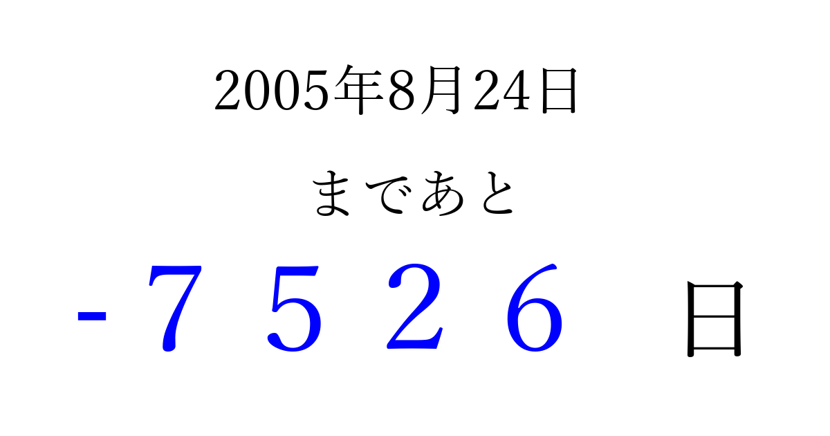 2005年8月24日(水)は もう 0000 日過ぎました 追加すると、トップページからすぐ選べるようになります ※2026/04/02現在の結果です。 最新の状態に更新する ↓シェアして、タイムライン上にカウントダウンを表示しよう!↓ 📤 この結果を共有する Tweet シェア Threads Bluesky 別の日付でカウントダウン 2005年8月のカレンダー このページをブックマークに追加すると、いつでもカウントダウンを確認できます。 (PC: Ctrl+D / Mac: ⌘+D) hitome-notes.comでは以下のページも運営しています。 指定日と期間から日付を計算 | ガチャ確率計算・シミュレーション | プライバシー・ポリシー 運営者:Avocado
