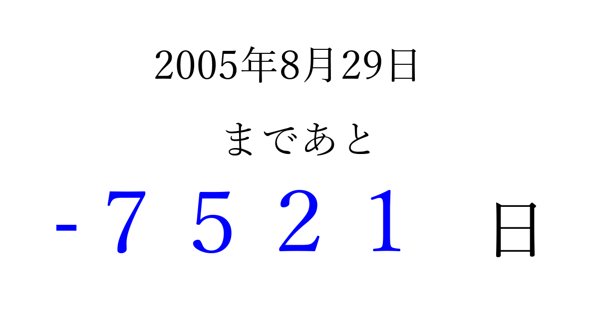 2005年8月29日(月)は もう 0000 日過ぎました 追加すると、トップページからすぐ選べるようになります ※2026/04/02現在の結果です。 最新の状態に更新する ↓シェアして、タイムライン上にカウントダウンを表示しよう!↓ 📤 この結果を共有する Tweet シェア Threads Bluesky 別の日付でカウントダウン 2005年8月のカレンダー このページをブックマークに追加すると、いつでもカウントダウンを確認できます。 (PC: Ctrl+D / Mac: ⌘+D) hitome-notes.comでは以下のページも運営しています。 指定日と期間から日付を計算 | ガチャ確率計算・シミュレーション | プライバシー・ポリシー 運営者:Avocado