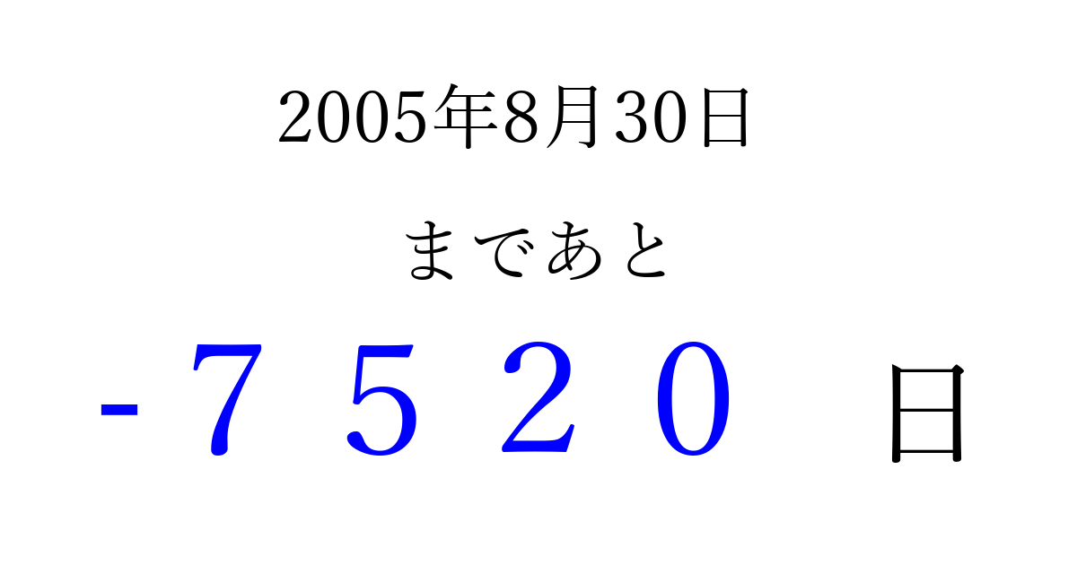 2005年8月30日(火)は もう 0000 日過ぎました 追加すると、トップページからすぐ選べるようになります ※2026/04/02現在の結果です。 最新の状態に更新する ↓シェアして、タイムライン上にカウントダウンを表示しよう!↓ 📤 この結果を共有する Tweet シェア Threads Bluesky 別の日付でカウントダウン 2005年8月のカレンダー このページをブックマークに追加すると、いつでもカウントダウンを確認できます。 (PC: Ctrl+D / Mac: ⌘+D) hitome-notes.comでは以下のページも運営しています。 指定日と期間から日付を計算 | ガチャ確率計算・シミュレーション | プライバシー・ポリシー 運営者:Avocado
