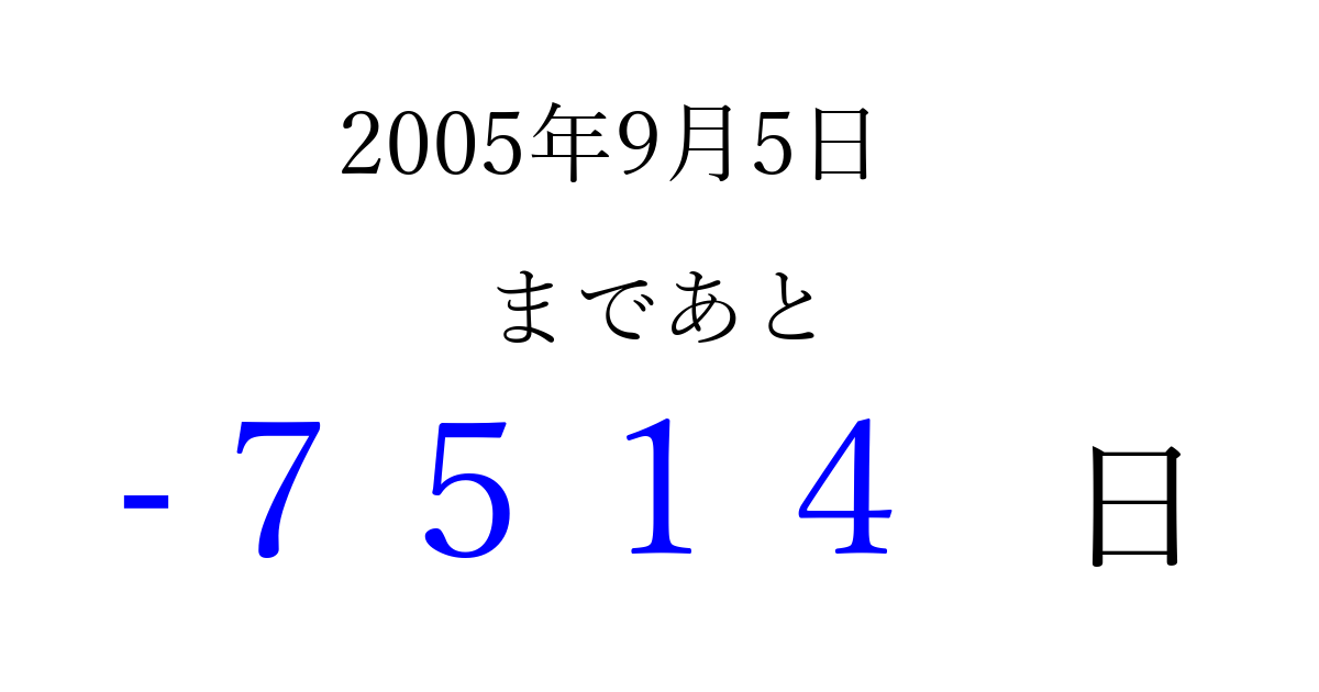 2005年9月5日(月)は もう 0000 日過ぎました 追加すると、トップページからすぐ選べるようになります ※2026/04/02現在の結果です。 最新の状態に更新する ↓シェアして、タイムライン上にカウントダウンを表示しよう!↓ 📤 この結果を共有する Tweet シェア Threads Bluesky 別の日付でカウントダウン 2005年9月のカレンダー このページをブックマークに追加すると、いつでもカウントダウンを確認できます。 (PC: Ctrl+D / Mac: ⌘+D) hitome-notes.comでは以下のページも運営しています。 指定日と期間から日付を計算 | ガチャ確率計算・シミュレーション | プライバシー・ポリシー 運営者:Avocado
