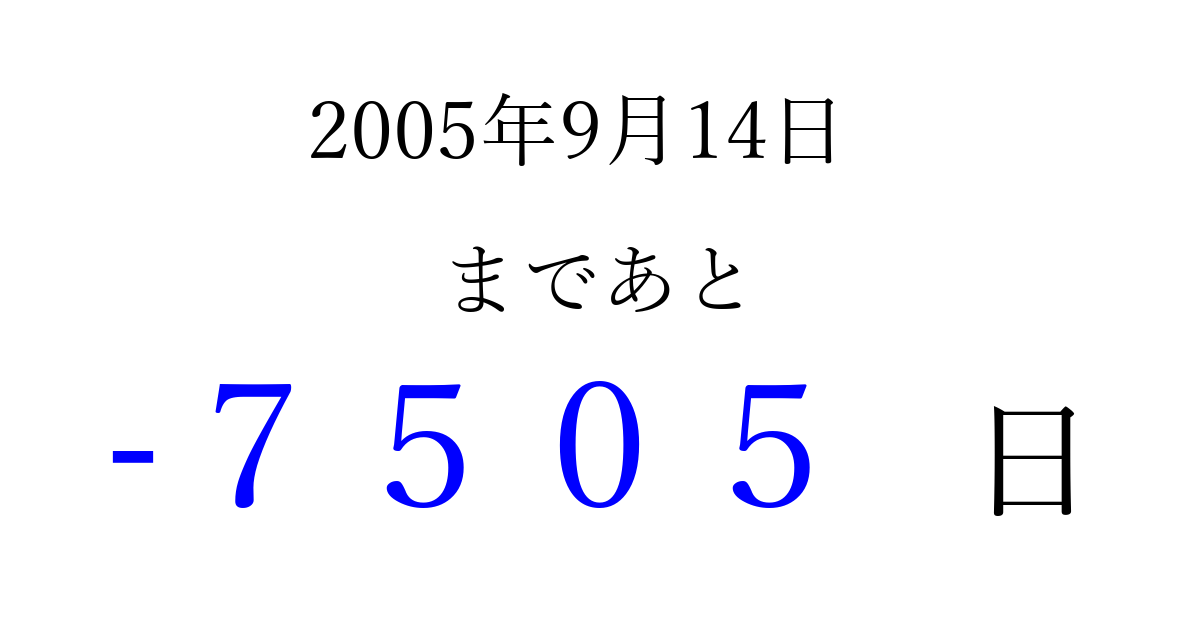 2005年9月14日(水)は もう 0000 日過ぎました 追加すると、トップページからすぐ選べるようになります ※2026/04/02現在の結果です。 最新の状態に更新する ↓シェアして、タイムライン上にカウントダウンを表示しよう!↓ 📤 この結果を共有する Tweet シェア Threads Bluesky 別の日付でカウントダウン 2005年9月のカレンダー このページをブックマークに追加すると、いつでもカウントダウンを確認できます。 (PC: Ctrl+D / Mac: ⌘+D) hitome-notes.comでは以下のページも運営しています。 指定日と期間から日付を計算 | ガチャ確率計算・シミュレーション | プライバシー・ポリシー 運営者:Avocado