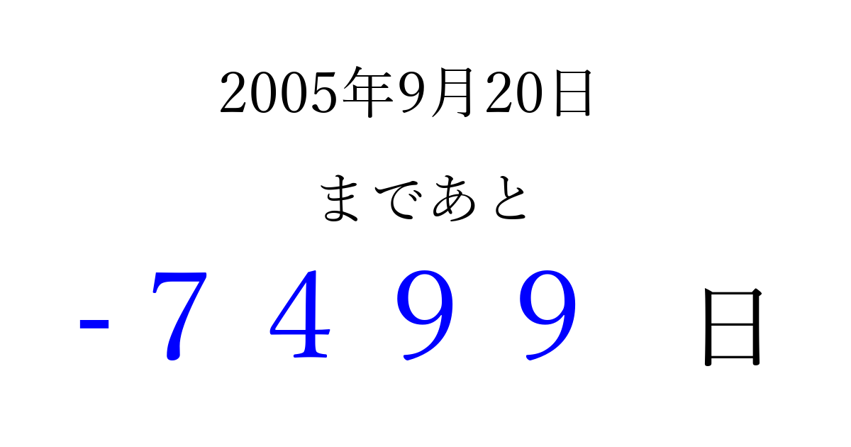 2005年9月20日(火)は もう 0000 日過ぎました 追加すると、トップページからすぐ選べるようになります ※2026/04/02現在の結果です。 最新の状態に更新する ↓シェアして、タイムライン上にカウントダウンを表示しよう!↓ 📤 この結果を共有する Tweet シェア Threads Bluesky 別の日付でカウントダウン 2005年9月のカレンダー このページをブックマークに追加すると、いつでもカウントダウンを確認できます。 (PC: Ctrl+D / Mac: ⌘+D) hitome-notes.comでは以下のページも運営しています。 指定日と期間から日付を計算 | ガチャ確率計算・シミュレーション | プライバシー・ポリシー 運営者:Avocado