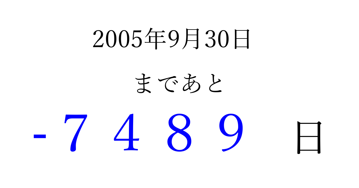 2005年9月30日(金)は もう 0000 日過ぎました 追加すると、トップページからすぐ選べるようになります ※2026/04/02現在の結果です。 最新の状態に更新する ↓シェアして、タイムライン上にカウントダウンを表示しよう!↓ 📤 この結果を共有する Tweet シェア Threads Bluesky 別の日付でカウントダウン 2005年9月のカレンダー このページをブックマークに追加すると、いつでもカウントダウンを確認できます。 (PC: Ctrl+D / Mac: ⌘+D) hitome-notes.comでは以下のページも運営しています。 指定日と期間から日付を計算 | ガチャ確率計算・シミュレーション | プライバシー・ポリシー 運営者:Avocado