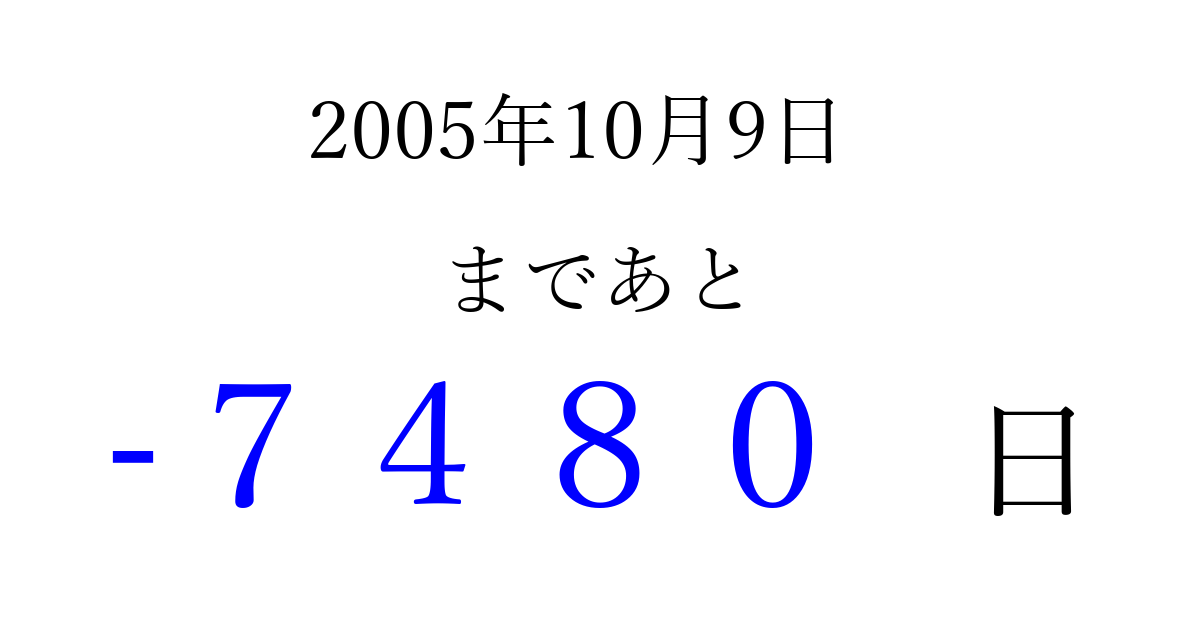 2005年10月9日(日)は もう 0000 日過ぎました 追加すると、トップページからすぐ選べるようになります ※2026/04/02現在の結果です。 最新の状態に更新する ↓シェアして、タイムライン上にカウントダウンを表示しよう!↓ 📤 この結果を共有する Tweet シェア Threads Bluesky 別の日付でカウントダウン 2005年10月のカレンダー このページをブックマークに追加すると、いつでもカウントダウンを確認できます。 (PC: Ctrl+D / Mac: ⌘+D) hitome-notes.comでは以下のページも運営しています。 指定日と期間から日付を計算 | ガチャ確率計算・シミュレーション | プライバシー・ポリシー 運営者:Avocado